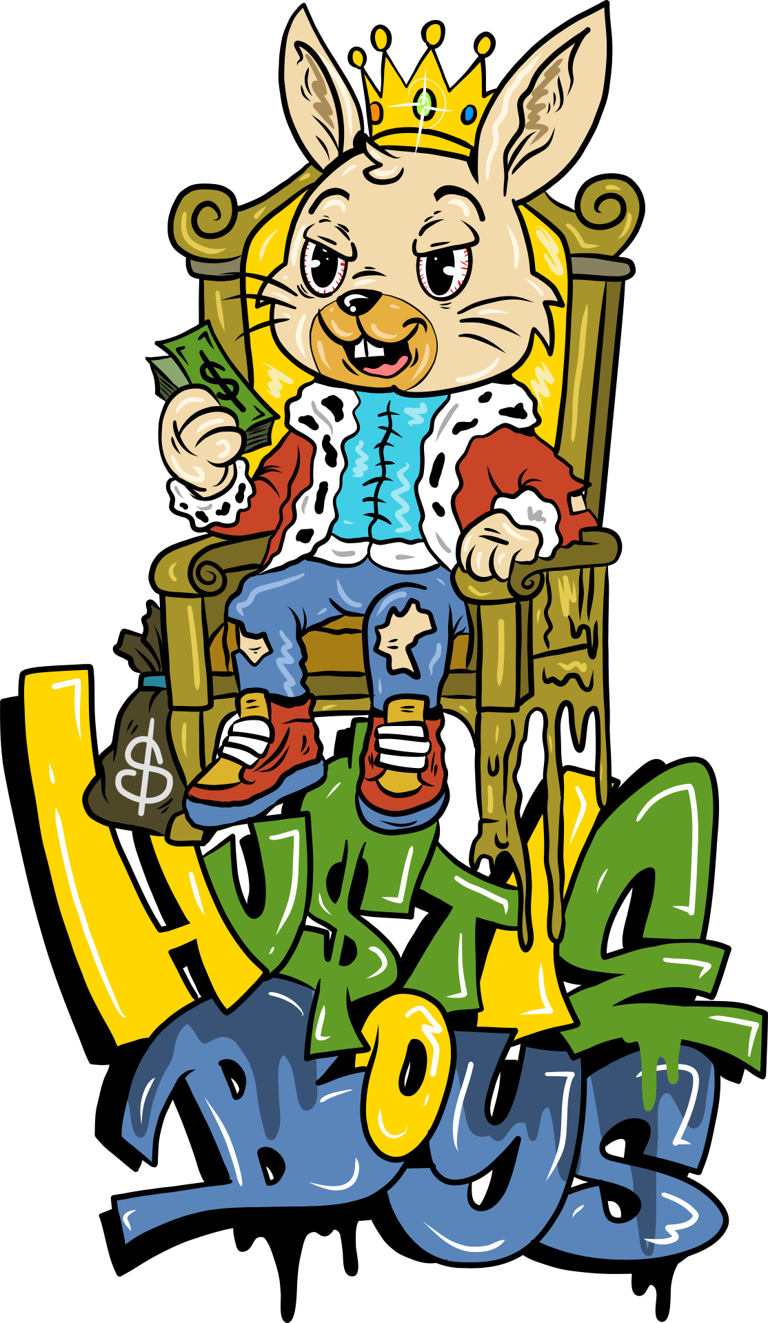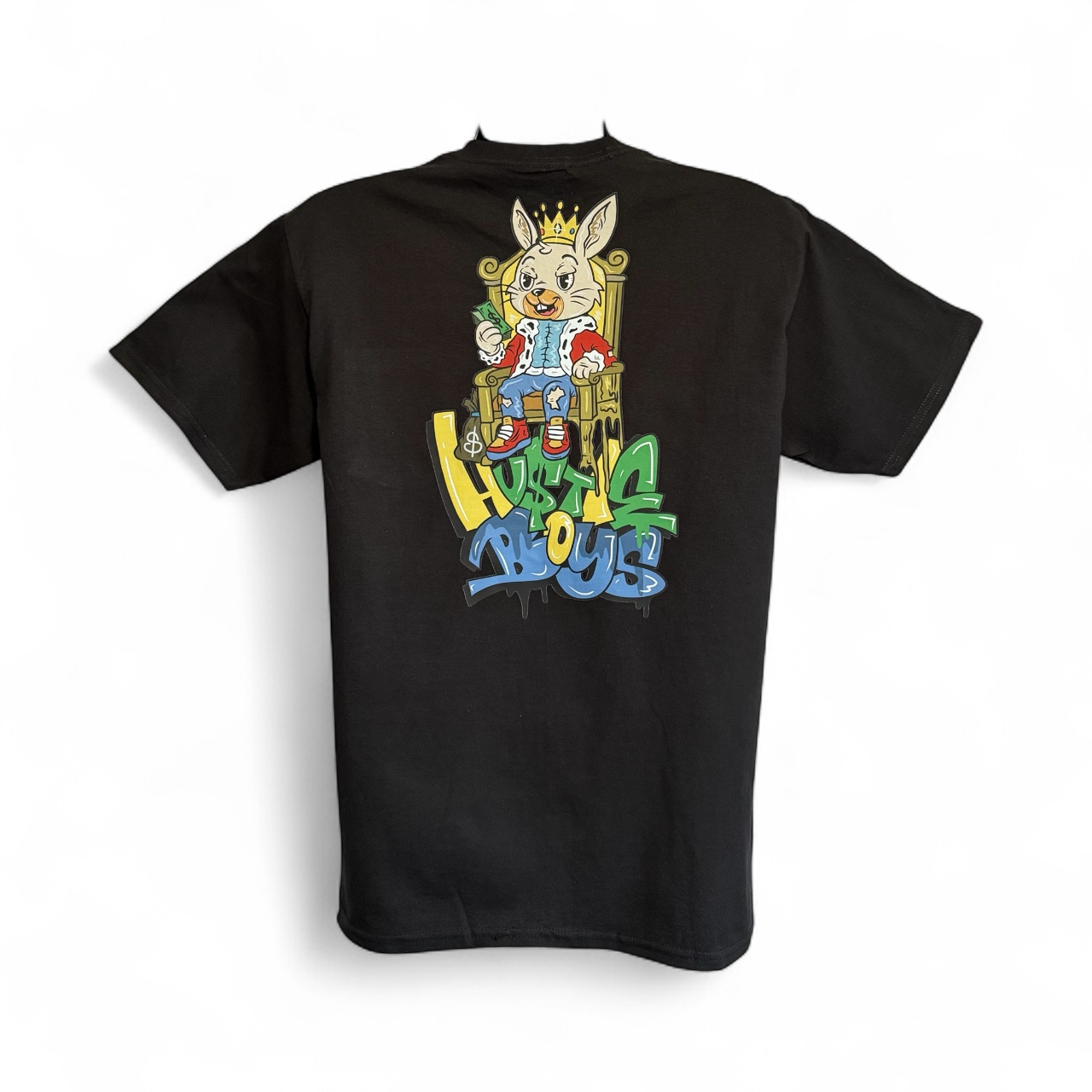 Rule your grind in style. The King Cash Hustle Boys Tee features the iconic Hustle Boys mascot — a streetwise king repping confidence, ambition, and attitude. With bold graffiti artwork on a solid black base, this tee captures the energy of the hustle and the pride of the streets.